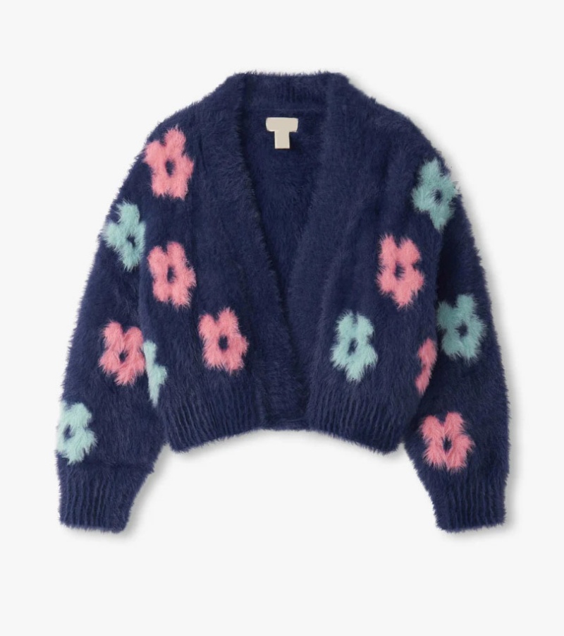 **Whimsical Big Flower Motifs:** Large, fuzzy flower accents in soft pink and mint green with navy centers serve as the focal point, adding a cheerful, bold burst of color against the deep navy base. This playful feature sets the cardigan apart from basic kidsâ layering pieces, making it a standout item for wholesale girlsâ fuzzy flower knit cardigans that captivate attention on shelves and social media.