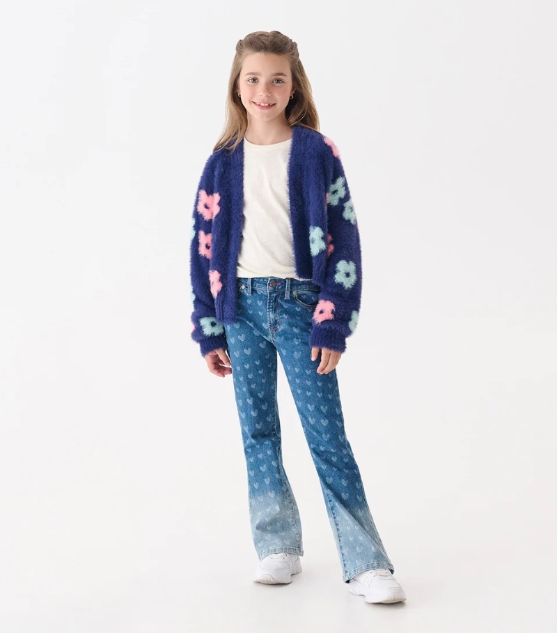 This girlsâ open fuzzy knit cardigan is crafted from 100% nylon, delivering ultra-soft texture and durable performance. Available in sizes 3Yâ12Y, it covers toddler to pre-teen ages with consistent fit across all sizesâstreamlining inventory management and minimizing sizing-related returns. Features include an open-front, button-free construction, dropped shoulders for a relaxed fit, 2x2 rib trims for structure, and large fuzzy flower motifs in complementary pastel hues. The deep navy blue base color offers versatile styling, pairing effortlessly with a wide range of kidsâ wardrobe staples. Positioned in the kidsâ whimsical premium knitwear category, itâs ideal for retailers focusing on statement kidsâ pieces, seasonal layering collections, or giftable apparel that brings joy.