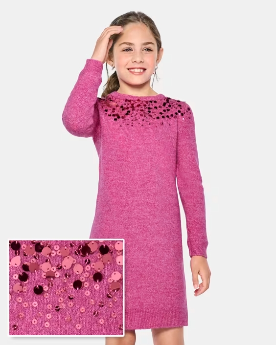 This girlsā sequin knit sweater dress is crafted from a soft, stretchy blend of acrylic, polyester, metallic thread, and spandexādelivering sparkle, comfort, and durability. Available in sizes 3Yā12Y, with detailed size guides (including height, weight, waist, and inseam measurements), it ensures precise fit across toddler to pre-teen agesāsimplifying inventory management and reducing sizing-related returns. Key design features include front sequin embellishments, rib-knit crew neck, long sleeves with rib-knit cuffs and hem, pullover style, and above-the-knee length. The charming pink colorway offers universal appeal, while the metallic thread adds an extra dimension of shimmer that elevates the dressās visual impact. It belongs to the kidsā sparkle knitwear categoryāideal for retailers focused on occasion wear, festive collections, or statement pieces that bring joy.