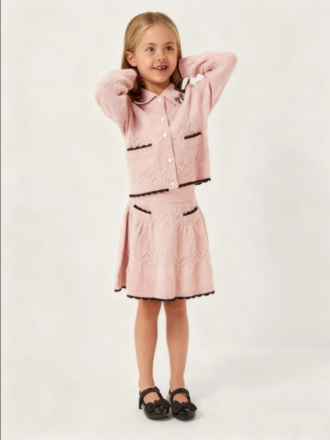 Crafted for children's fashion retailers, girls' specialty boutiques, and retro-inspired kidswear curators, this girls' bow collar knit cardigan and skirt set revives 90s nostalgia with modern flair—filling a unique niche in girls' occasion and everyday wear. Designed to delight young girls with its pretty details and parents with its sustainable blend, it caters to birthday parties, school events, or family gatherings for ages 3Y-12Y. The baby pink base with black scallop trims delivers timeless femininity, while glitzy bows add sparkling charm that stands out in retail displays. The coordinated two-piece design offers effortless styling, resonating with busy parents seeking cohesive, photo-ready outfits. Adding this set to your lineup positions your retail brand as a curator of on-trend, nostalgic pieces that blend style, sustainability, and kid-approved appeal.